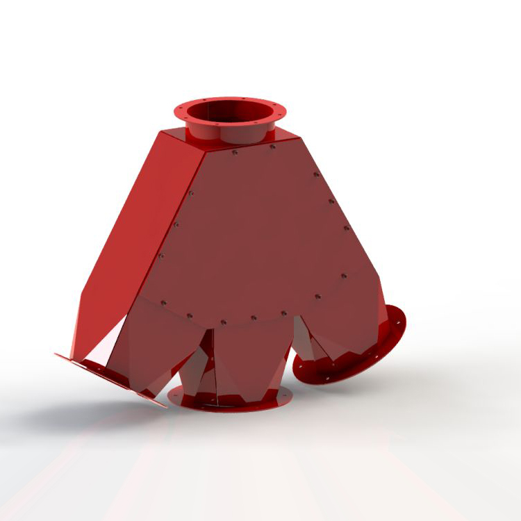 Rozdzielacze pneumatyczne służą do rozdziału strugi materiału. Pracują bądź w systemie 1-2 bądź klapa jest procentowo pozycjonowana. Stosujemy uszczelnienia klap dopasowane do konkretnego medium. Kształt oraz przyłącza są uzależnione od wymagań miejsca instalacji. Wykonujemy rozdzielacze w stali węglowej oraz nierdzewnej. W razie potrzeby przewidujemy okna wizyjne.